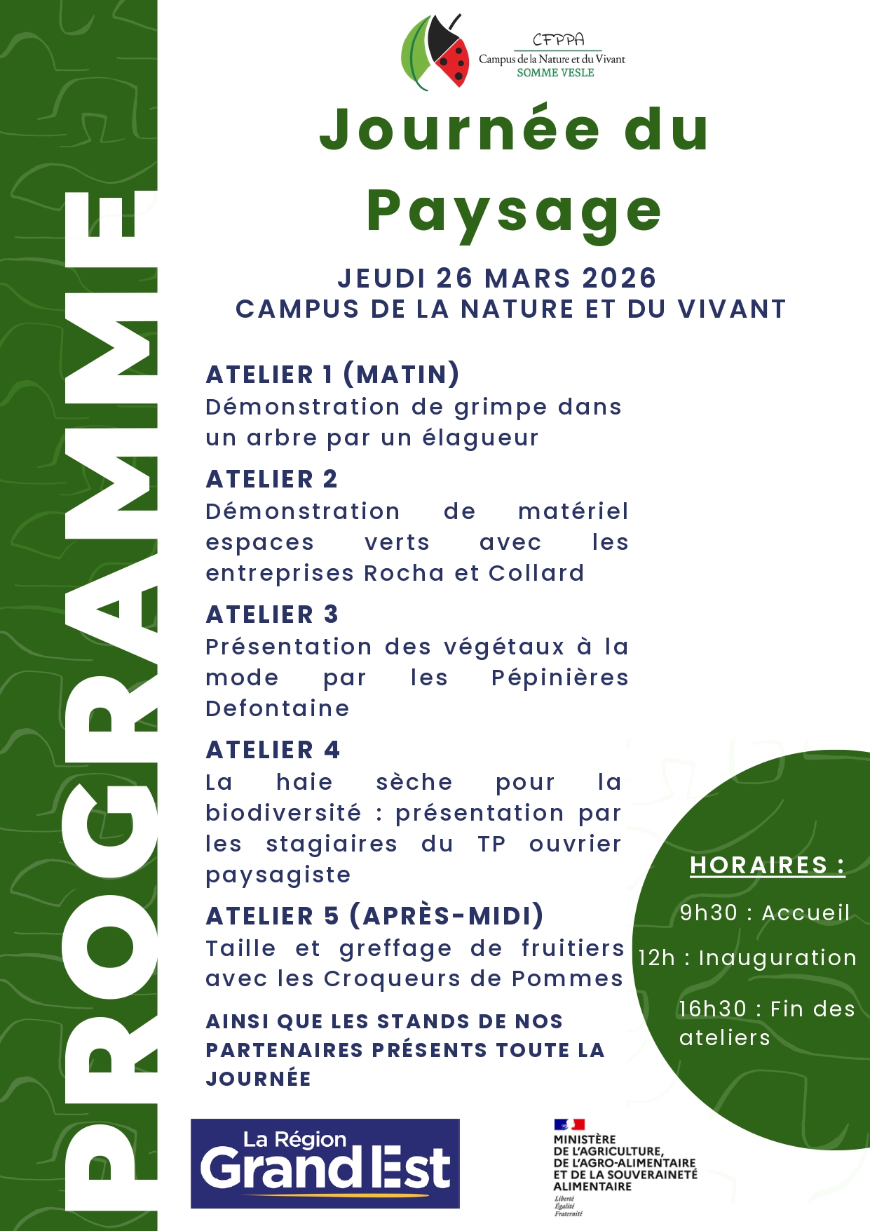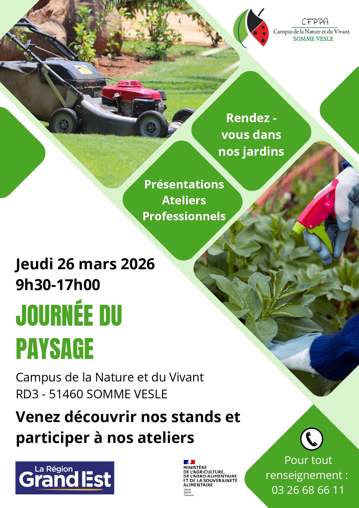 Au programme : démonstrations, ateliers et présentations animés par des professionnels du paysage : grimpe d’élagage, démonstration de matériel d’espaces verts, présentation de végétaux, découverte de la haie sèche pour la biodiversité et atelier de taille et greffage de fruitiers. Des stands de partenaires seront également présents toute la journée. Campus de la Nature et du Vivant – RD3, 51460 Somme-Vesle Renseignements : 03 26 68 66 11 |